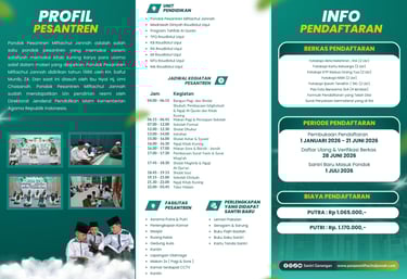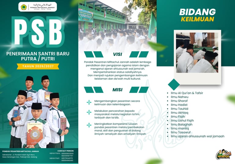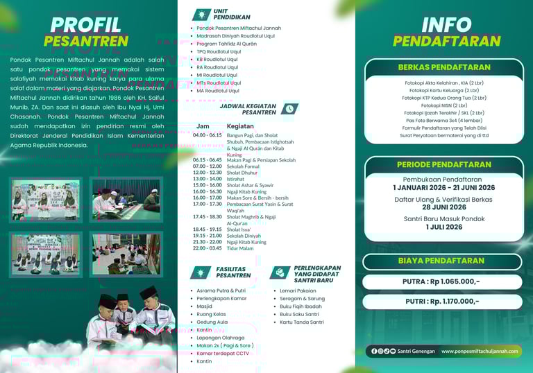 Pendaftaran atau pengambilan formulir silahkan datang ke kantor pesantren
